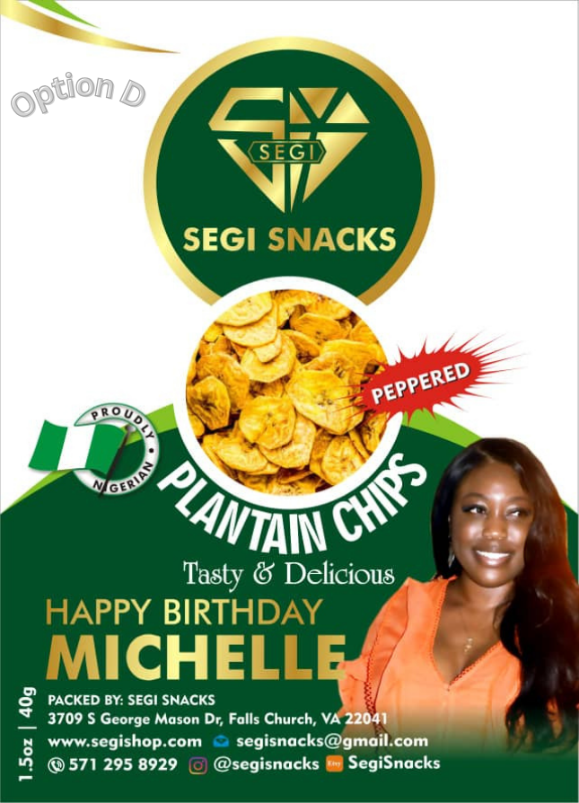 Customized Event Label – Option D = Snack image (1 large) centers the package and Custom photo (1 large) edited to hover the right corner of the package label. Max 28 custom text characters